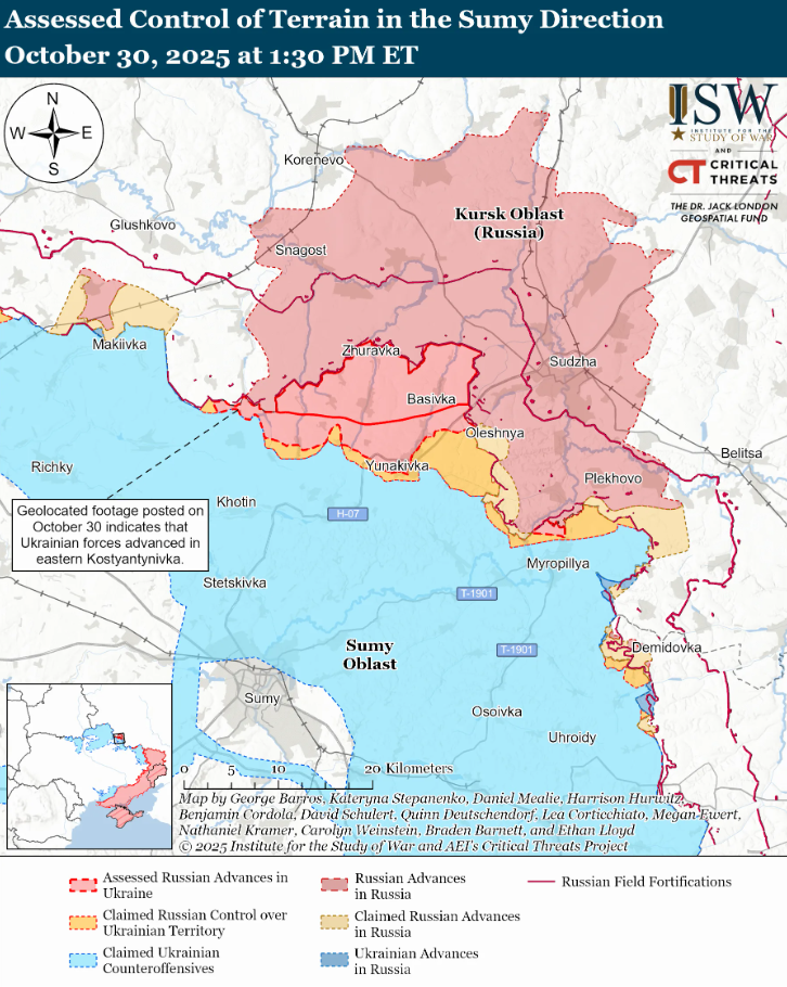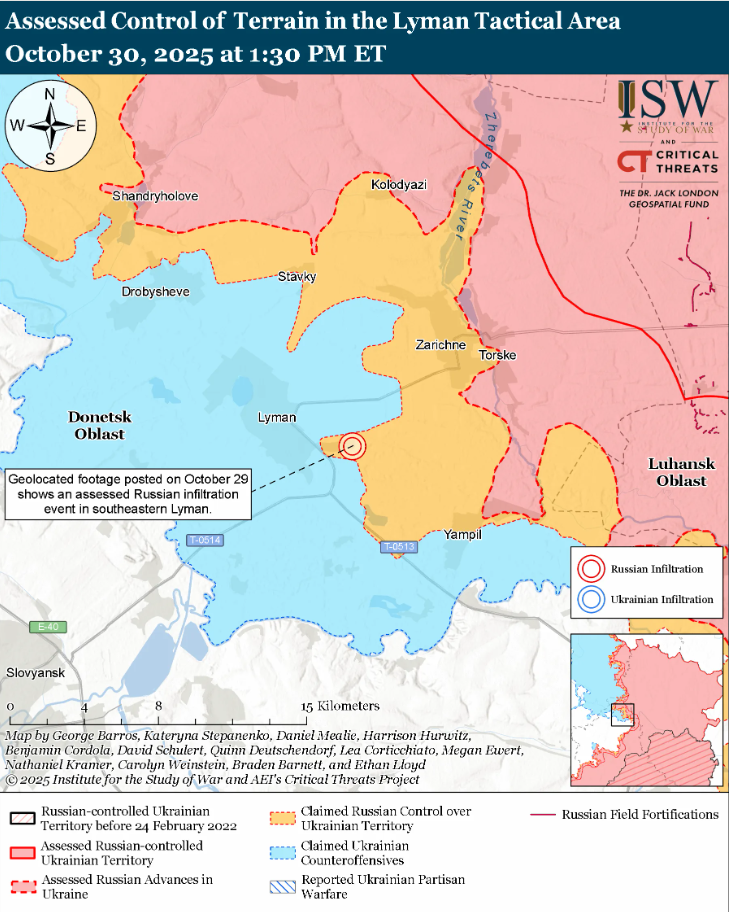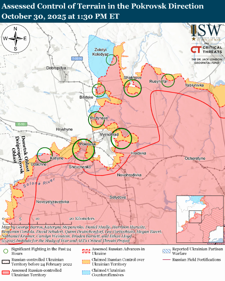 На геолокационных видеозаписях, опубликованных 28 октября, видно, что украинские войска наносят удар по российским позициям на пересечении Донецкой железной дороги и автомагистрали Т-0515 Покровск-Доброполье в восточном Покровске после того, что ISW оценивает как российскую миссию инфильтрации. ISW оценивает, что это событие не изменило контроль над местностью или передним краем зоны боевых действий.