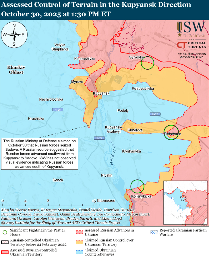 Министерство обороны России и российские милблогеры 30 октября заявили, что российские войска захватили Садовое (к югу от Купянска) и продвинулись на юго-запад Купянска. ISW не обнаружила доказательств этому.