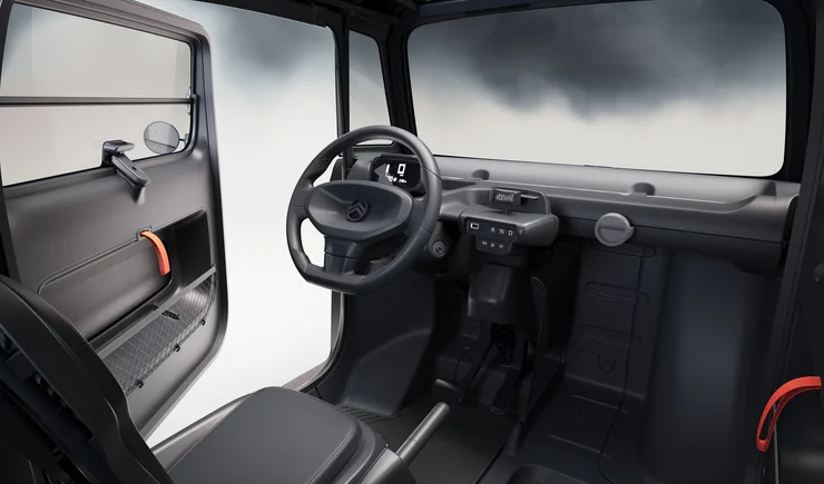 Салон Citroen Ami выдержан в темных тонах в большинстве версий. Внутри появились дополнительные отсеки для мелких вещей, а также крючки и сетки для фиксации багажа.