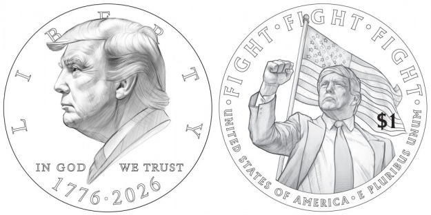 На эскизах на аверсе монеты изображен Трамп в профиль с надписью «Liberty» вверху, «In God we Trust» внизу и датами 1776 и 2026.