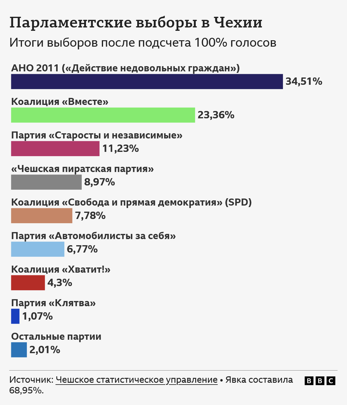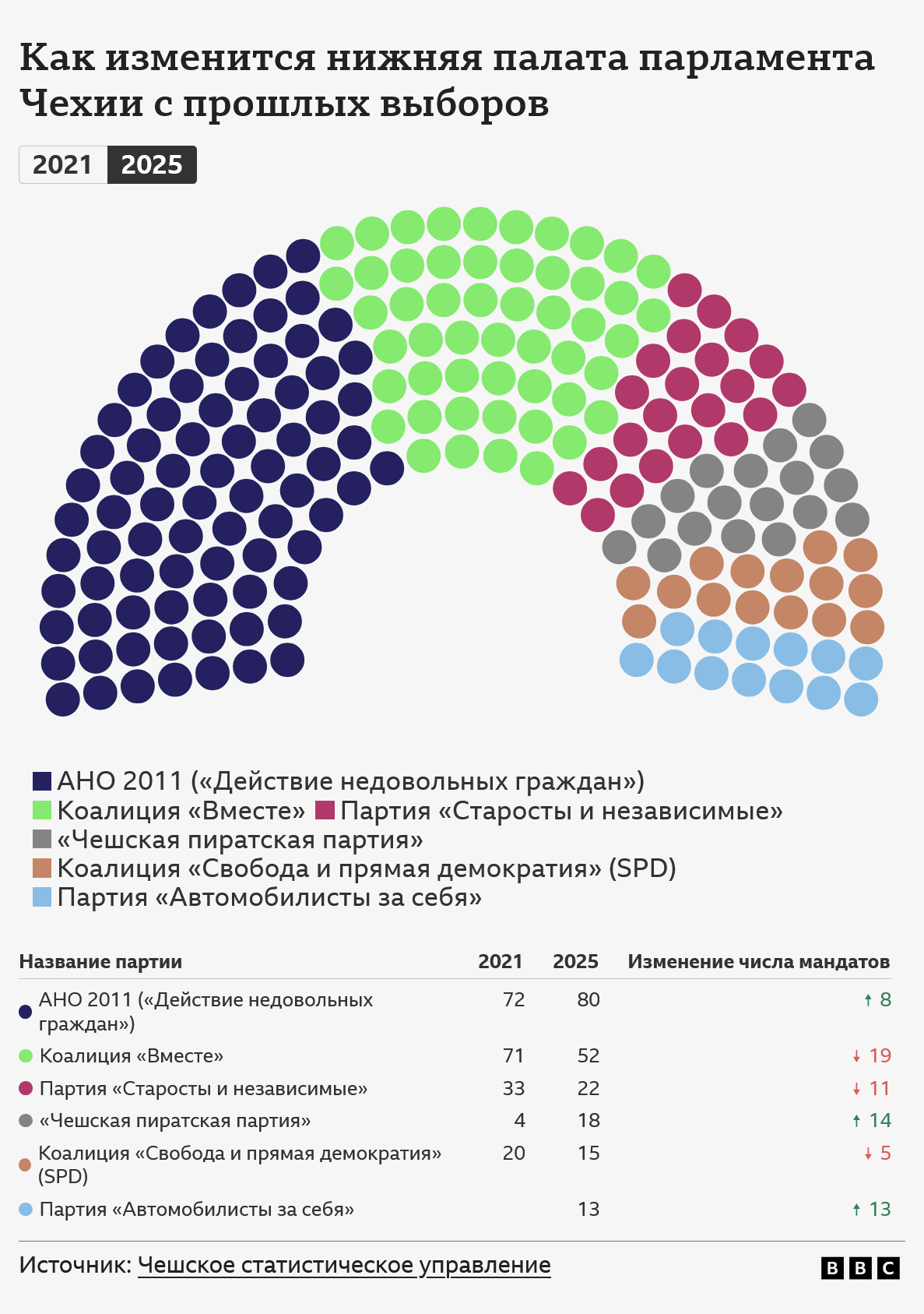 По подсчетам чешского новостного агентства ČTK, ANO, SPD и «Автомобилисты» вместе получат максимум 116 мест в нижней палате парламента из 200. Этого достаточно для обычного большинства, но недостаточно для большинства конституционного.