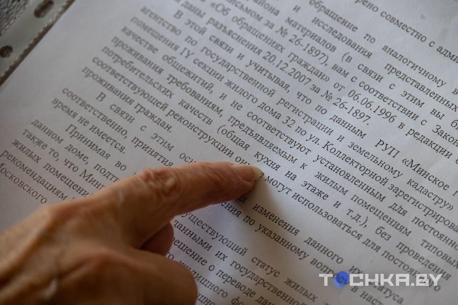 К слову, в этот промежуток времени люди узнали, что их подъезд вообще не зарегистрирован в Минске. В одном из писем пришел ответ: никаких сведений в БТИ об их жилых помещениях нет. Целого подъезда словно не существовало, и так было до прошлого года.