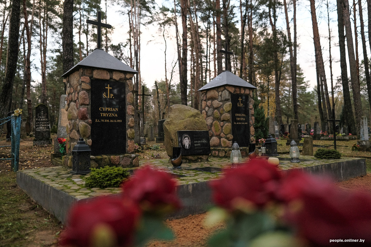Вось такі прыгожы помнік паставілі на магіле мясцовага жыхара Цыпрыяна Трызны, ягонай жонкі і ўнучак. Як распавялі сваякі Цыпрыяна, якіх мы сустрэлі на могілках, помнік сімвалізуе вежы рубяжэвіцкага касцёла: іх калісьці ўзводзіў Цыпрыян. На магільнай шыльдачцы так і напісана: «Пакрываў вежы, устанавіў крыжы і, падняўшыся на крыж, прамовіў: «Будаўніцтва касцёла завершана!»