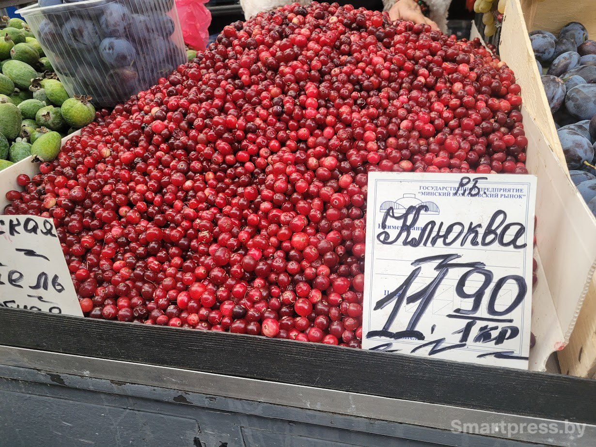 Из ягод на рынке есть немного слив (3-6 рублей за 1 кг), малина (30 рублей за 1 кг), брусника, клюква (11-12 рублей за 1 кг) и облепиха.
