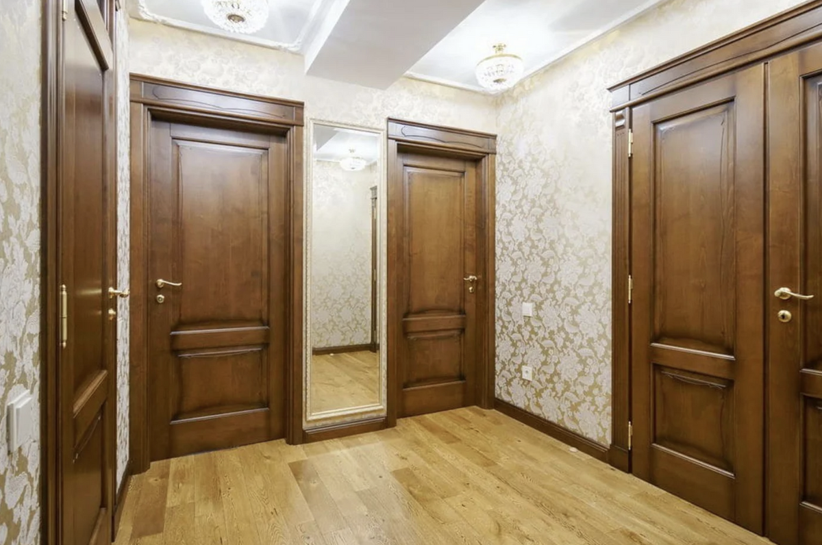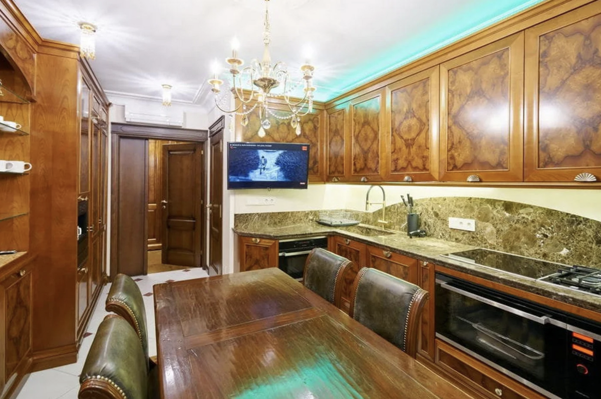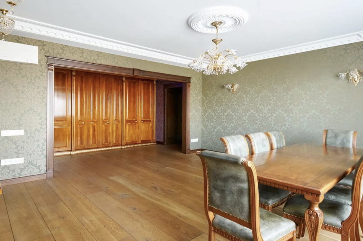 Интерьер в квартире с элементами классики. Много дерева и величественных элементов. Глядя на обстановку, нельзя не порефлексировать о том, как же сильно спустя годы изменилось понятие дорогого и элитного интерьера. Кстати, прежний собственник дома значительно обновил ремонт, оставив стилистику: