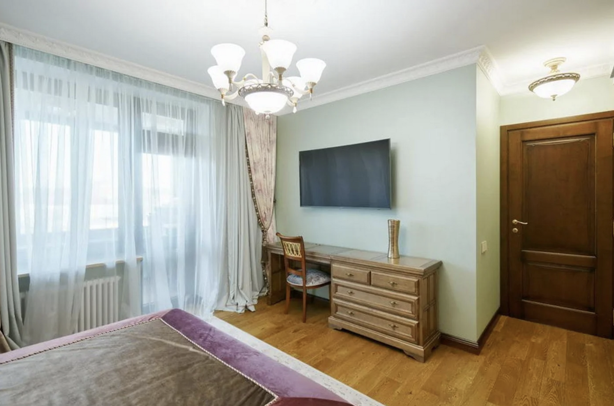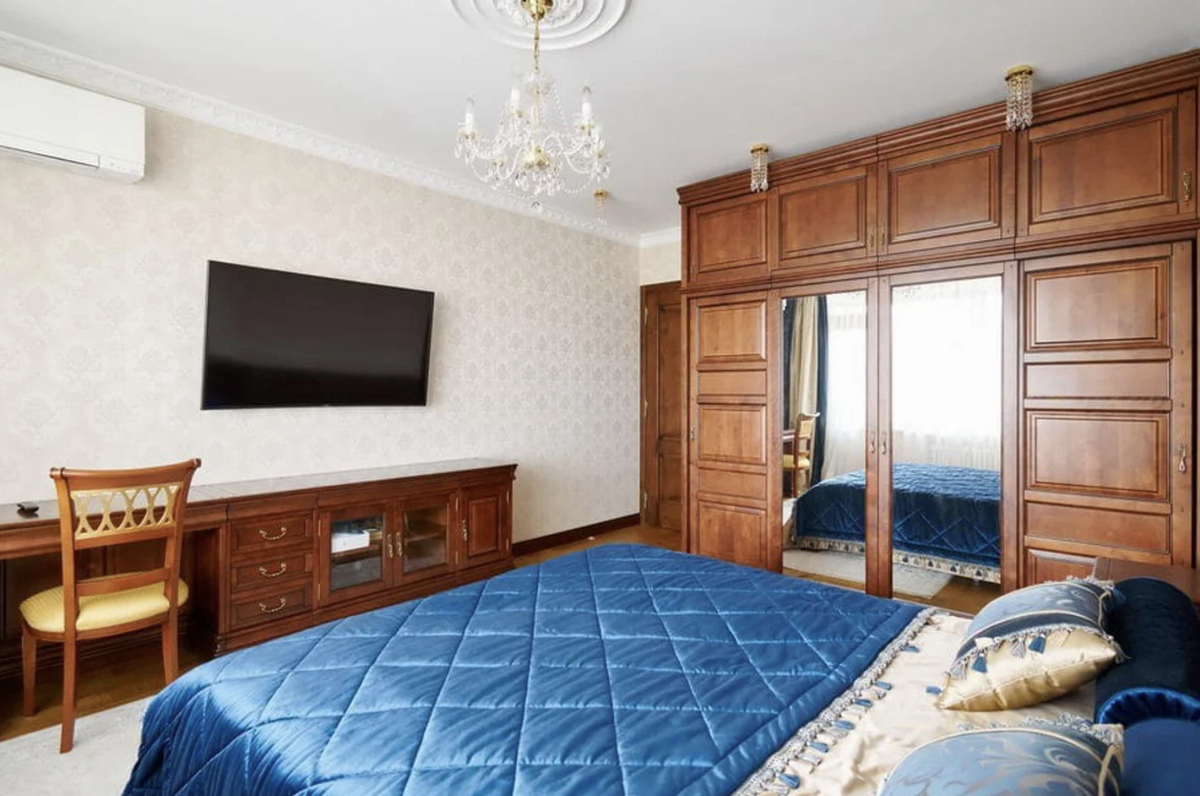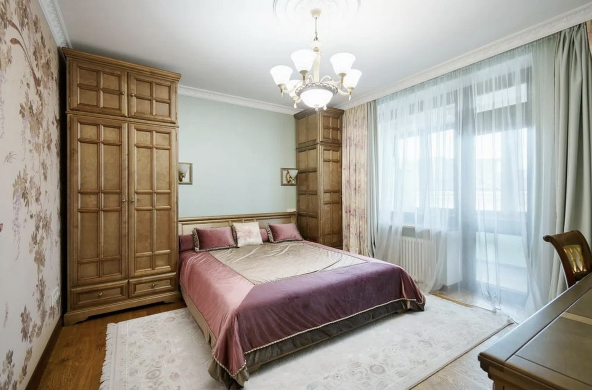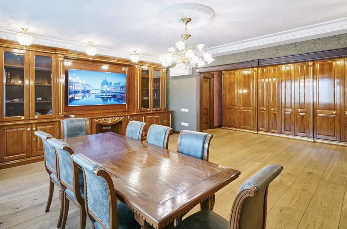 Интерьер в квартире с элементами классики. Много дерева и величественных элементов. Глядя на обстановку, нельзя не порефлексировать о том, как же сильно спустя годы изменилось понятие дорогого и элитного интерьера. Кстати, прежний собственник дома значительно обновил ремонт, оставив стилистику: