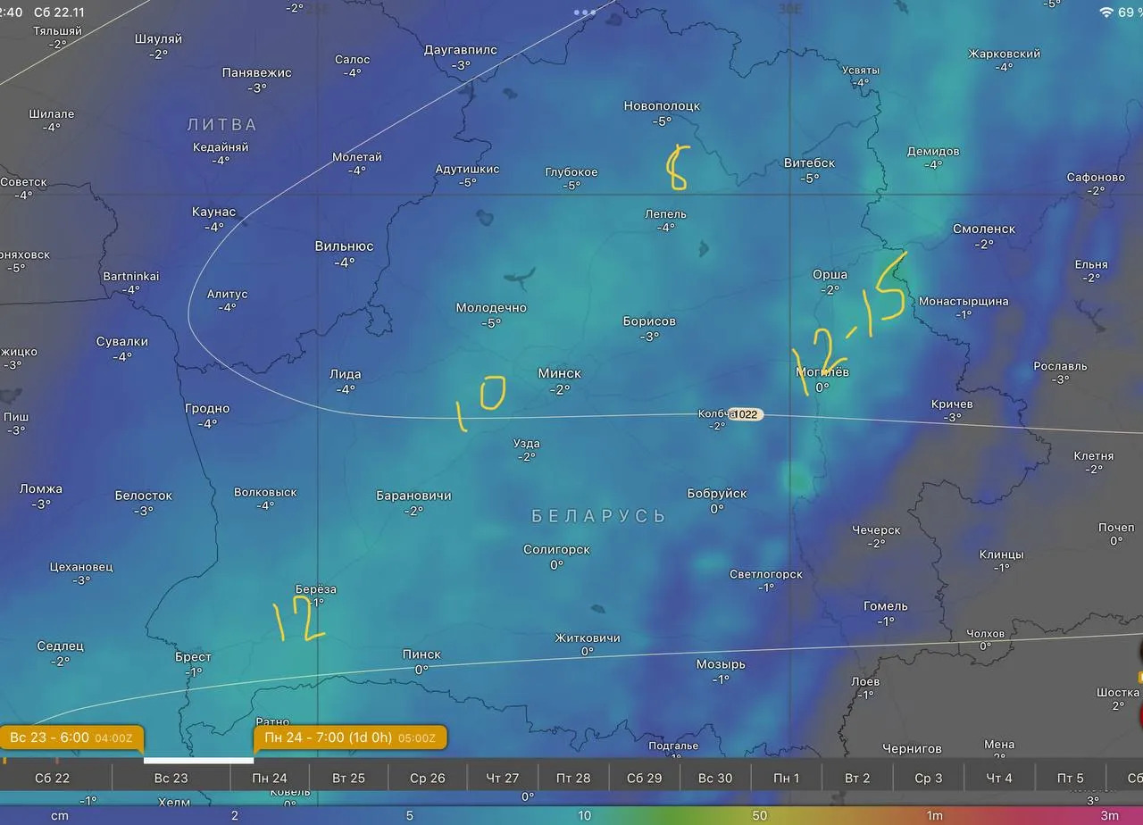 К обеду снегопады охватят всю южную половину страны. Интересно, что днем Гомельская область окажется в теплом секторе циклона. Здесь потеплеет до +2..+5°, снег перейдет в дождь, и все, что успело выпасть, растает.