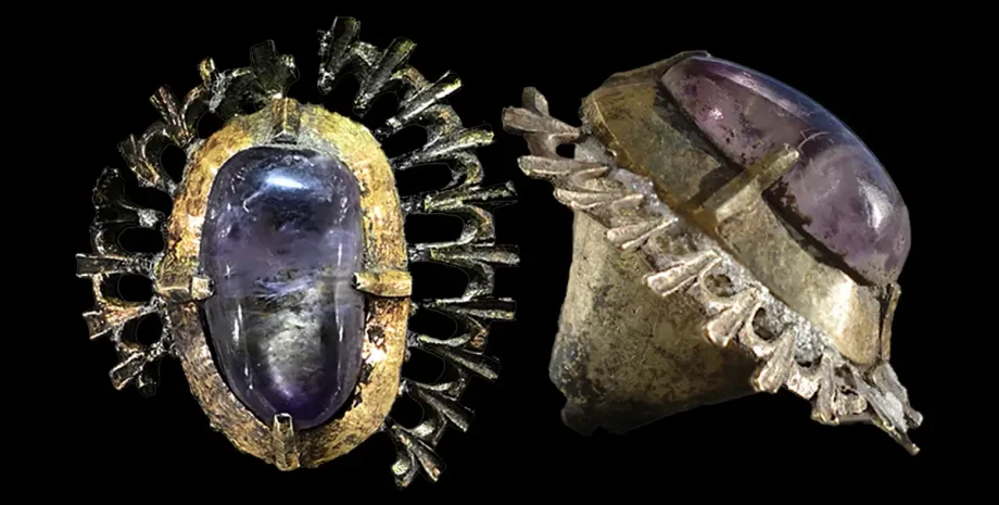 Они объяснили, что аметист был установлен как кабошон в конусообразной оправе с ажурными лучами или лепесткообразными формами вокруг него. В исследовании также отмечалось: «Согласно средневековому фольклору, аметист защищал от яда, символизируя веру, скромность и мученичество. Он должен был защищать от подагры, кошмаров, измены, обмана, плена, слепоты, очарования и удушения».