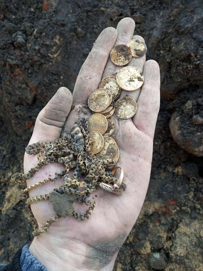 «Обратил внимание на что-то жёлтое в земле, на монету. Подумал, что советский пятак. Присмотрелся — оказалось, золотая монета с профилем Николая II. Затем ещё одна, ещё... Потом попалась зубная коронка... Стало неловко... Дальше там же выглянула из земли цепь (для цепочки немного великовата), кольцо, и снова монеты, монеты».
