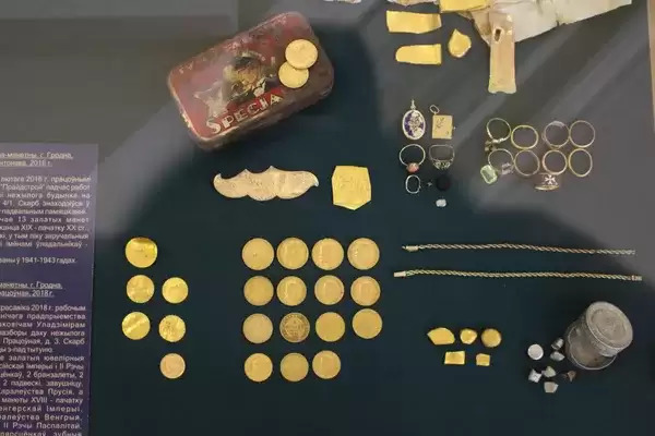 На стройку тут же вызвали милицию и подключили музейных работников. Оказалось, что здание, где нашли золото, было построено в 1894 году, а в годы Второй Мировой в нём располагалось еврейское гетто. Сюда были согнаны 30 тысяч евреев, которых затем отправили в лагеря смерти. Вероятно, чтобы не отдавать ценности оккупационным властям, люди что-то прятали, надеясь вернуться за ними. Гродненские историки пришли к выводу, что вряд ли эти сокровища спрятала одна семья — на обручальных кольцах разные даты и разные инициалы...
