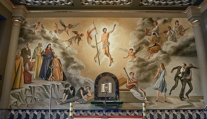 В этом очень концептуально оформленном храме каждый образ имеет смысл, и в другой части фрески были изображены двое спящих солдат. Они символизировали римских стражей у Гроба Христа, которые проспали Его Воскресение.
