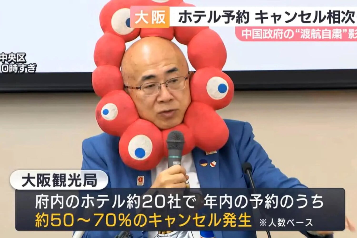 На пресс-конференции, посвященной влиянию политики на туризм, президент Бюро конгрессов и туризма Осаки Хироси Мидзёхата представлял тревожную статистику. Однако внимание аудитории приковывал к себе не только его доклад, но и ярко-красный плюшевый головной убор, обрамлявший его лицо и напоминающий корону с глазами.