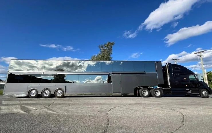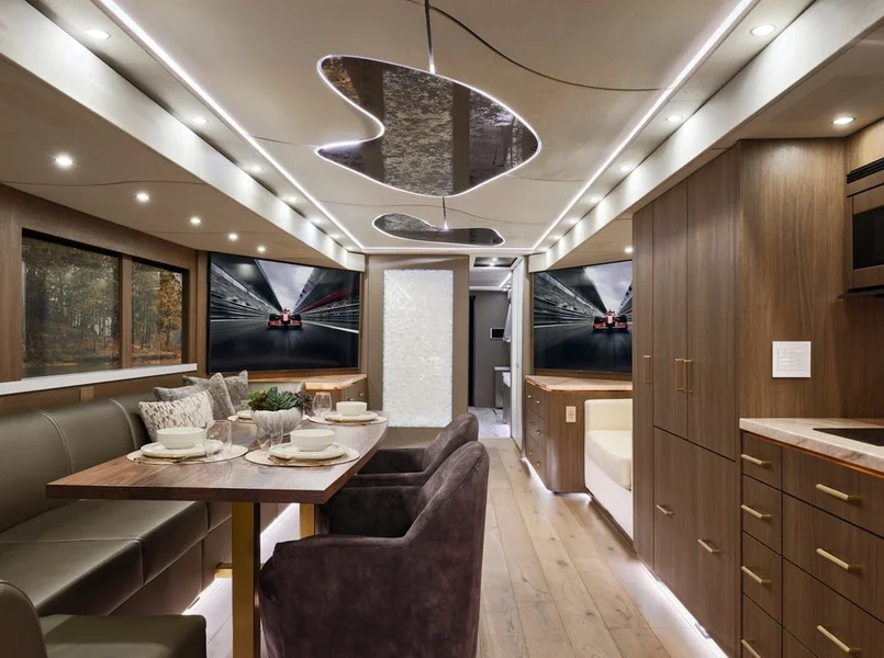 В США создали эксклюзивный дом на колесах представительского класса. Внутри есть бар, гардероб, лаунж-зона, камин и два домашних кинотреатра.