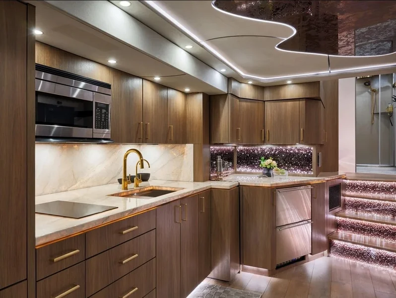 В отделке использовали дорогие кожу, ореховое дерево и плитку. Специально для Zenith заказывали авторскую мебель.