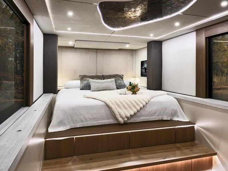 Внутри оборудовали 8 спальных мест, 3 санузла, лаунж-зону полноценный гардероб и большую кухню со скрытым баром. Кроме того, предусмотрены два домашних кинотеатра, мощная акустическая система, настоящий камин и регулируемая подсветка, которая имитирует звездное небо на потолке.