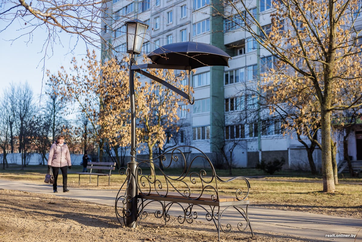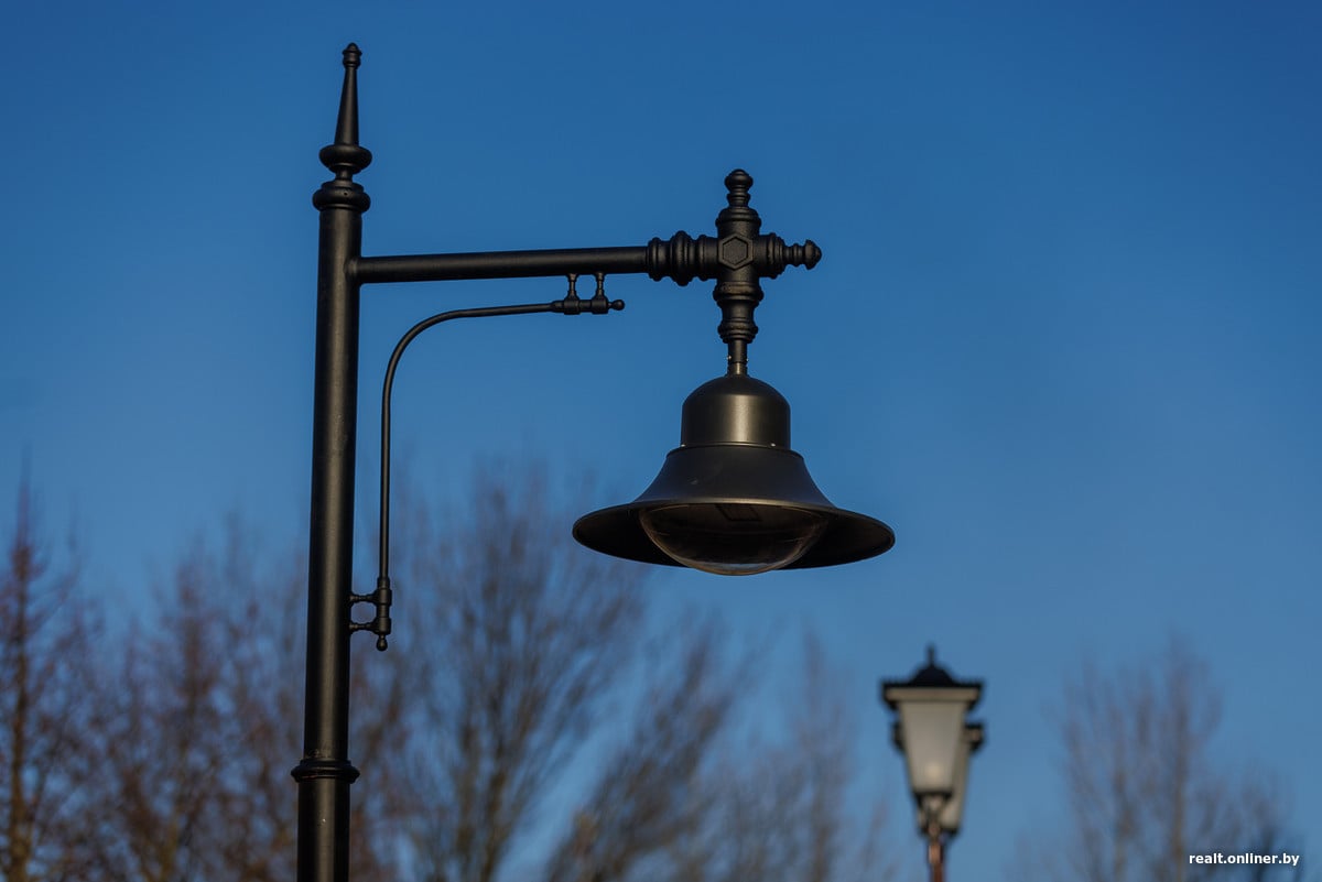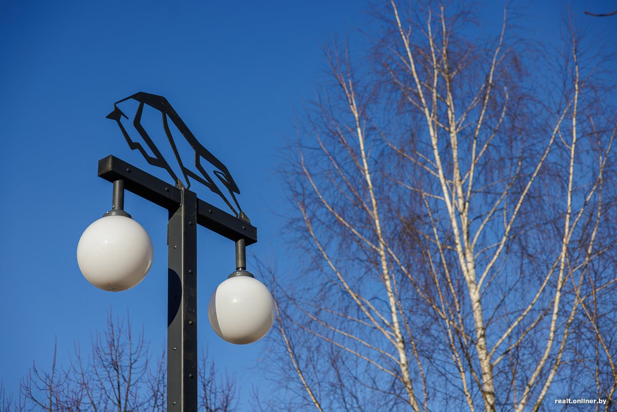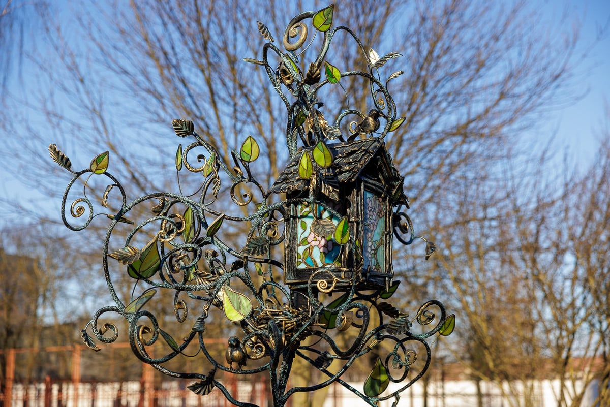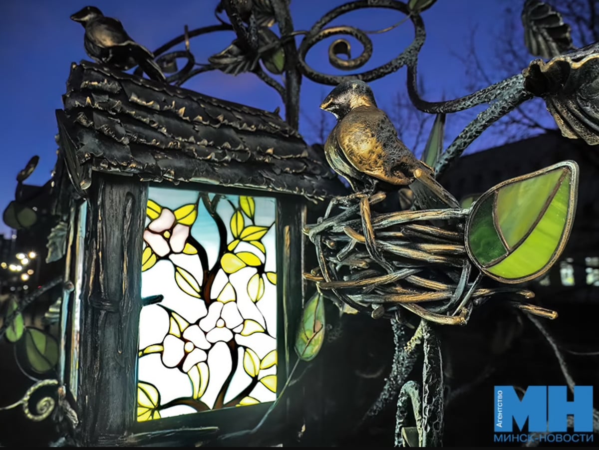 Место получилось разнообразным — здесь есть и классические модели фонарей, и минималистичные, а также совсем нестандартные варианты: фонарь с зонтиком, с зубром… Один из них особенно привлекает внимание — он украшен витражами, коваными ветвями и птицами на них.