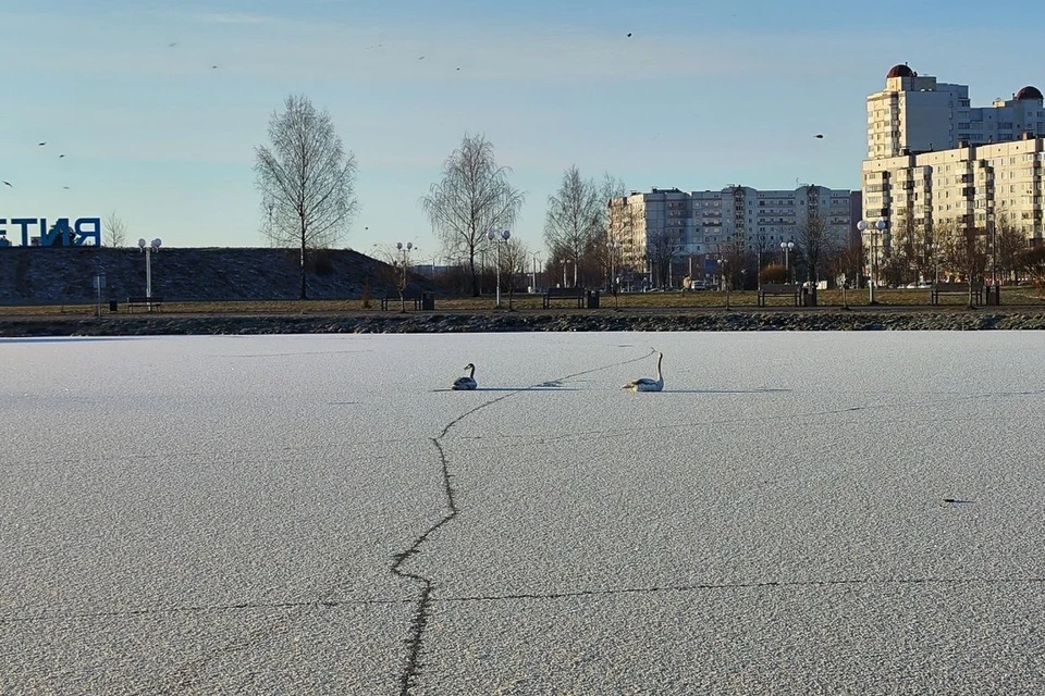 В Витебске белорусы вызвали водолазов из-за пары замерших на льду лебедей