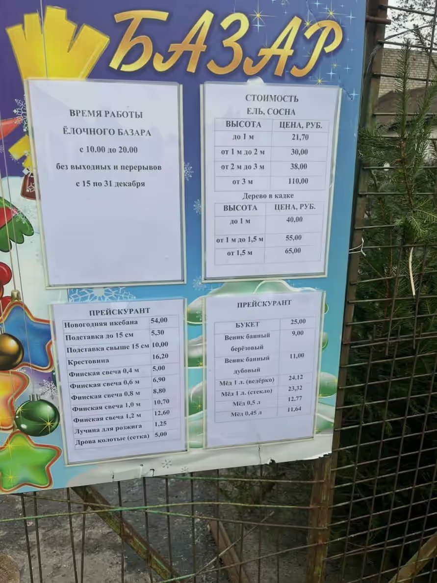 Журналист нашего портала попытался купить елку не в столице, а в районном центре — Марьиной Горке. Это удалось сделать не с первого раза. 24 декабря елки продавали в центре только в рабочее время, а к 17:00 всю продажу свернули. А вот 25 декабря елки и сосны были в наличии, причем цены были значительно ниже столичных. елка высотой 1,7 метра обошлась в 19,5 рубля.