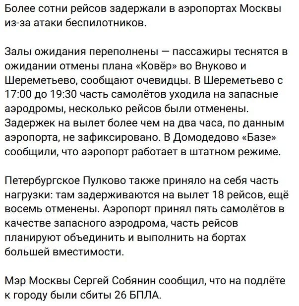 Тем временем мэр Москвы Сергей Собянин подтвердил массированный налет дронов на город. По его словам, на подлете к Москве якобы были сбиты 26 беспилотников.