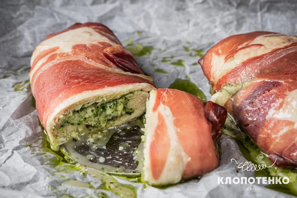 Приготовьте соус песто: для этого выложите в чашу блендера 50 г листьев базилика, 20 г натертого на мелкую терку пармезана, 60 г оливкового масла, 30 г орешков и щепотку соли. Перебейте ингредиенты блендером до однородности и смажте филе соусом, необходимо примерно по 1 ст. л. на крученик.