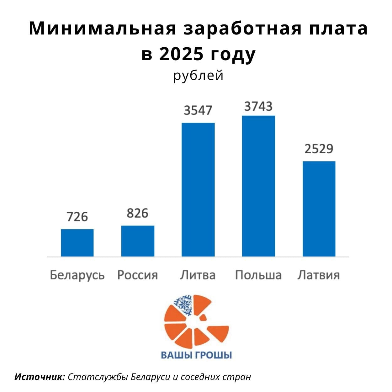В текущем 2025 году белоруская «минималка» равна 726 рублям в месяц. При этом в РФ минимальная зарплата в пересчете на белорусские рубли — 826 рублей. А в странах-соседках, входящий в Евросоюз, в несколько раз выше: в Латвии работающие на «минималках» получают в эквиваленте около 2529 белорусских рублей, в Литве — 3547, в Польше — 3743. Или почти в 3,5—5 раз больше.