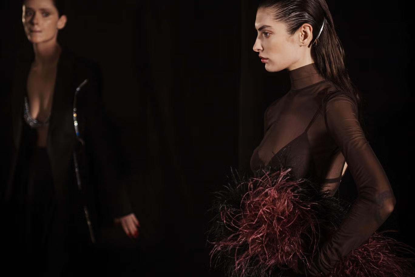 Возвращается и стиль «сдержанной роскоши»: свободные костюмные силуэты, бархатные комплекты, атласные рубашки и струящиеся блузы. Отдельный тренд — полупрозрачные ткани: шифон, сетка, шелк и дюшес, которые предлагается использовать аккуратно — в обуви, накидках или вставках.
