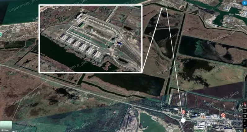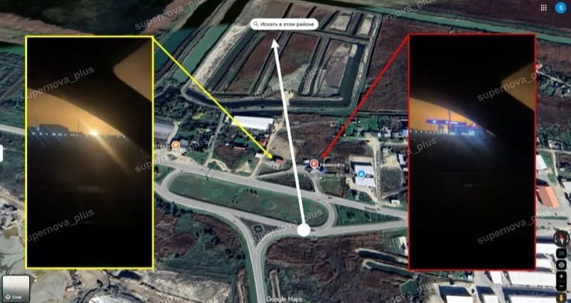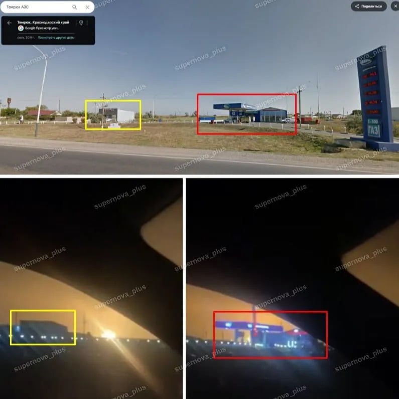 В ASTRA проанализировали кадры из Темрюка – и пришли к выводу, что одно из видео снято с трассы Темрюк-ст.Голубицкая, расстояние от точки съемки до порта — 4 км. Согласно OSINT-анализу издания, горит газовый терминал.