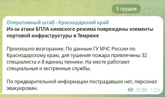 Об атаке дронов на Темрюкский морской порт в Краснодарском крае РФ первые сообщения в сети начали появляться около полуночи 5 декабря.