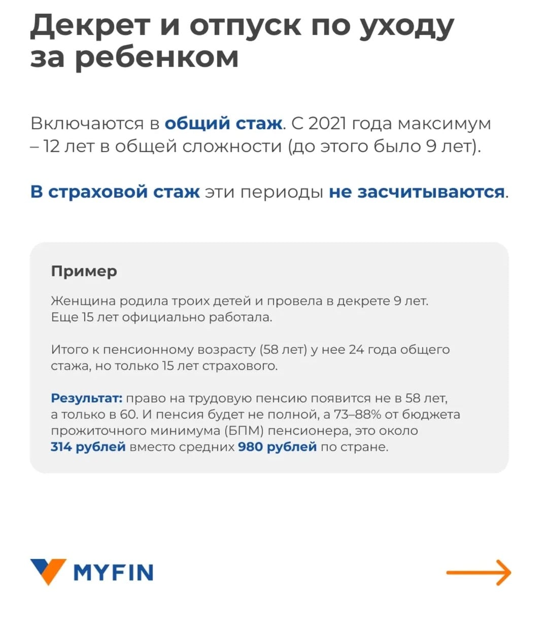 По закону в Беларуси время, проведенное родителем (как правило, это мать) в отпуске по уходу за ребенком, включается в общий стаж при назначении пенсии, но не в страховой стаж, который также сильно влияет на будущее. Это связано с тем, что в это время не платятся страховые взносы. При этом с 2025-го требуемый минимальный страховой стаж составляет 20 лет.