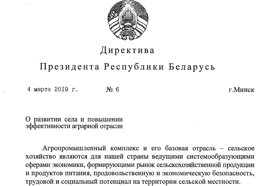 Весной 2014-го власти анонсировали подписание Директивы №5 под названием «О мерах по повышению конкурентоспособности сельскохозяйственных организаций и престижа работы в агропромышленном комплексе».