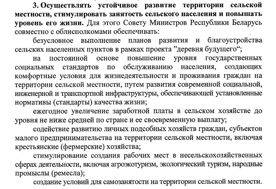 И да, новая директива обещала ежегодный рост зарплат в АПК «до уровня не ниже среднего заработка по стране». В целом, правительству и облисполкомам предписывалось «безусловное выполнение планов развития и благоустройства» сельских населенных пунктов в рамках проекта «Деревня будущего».
