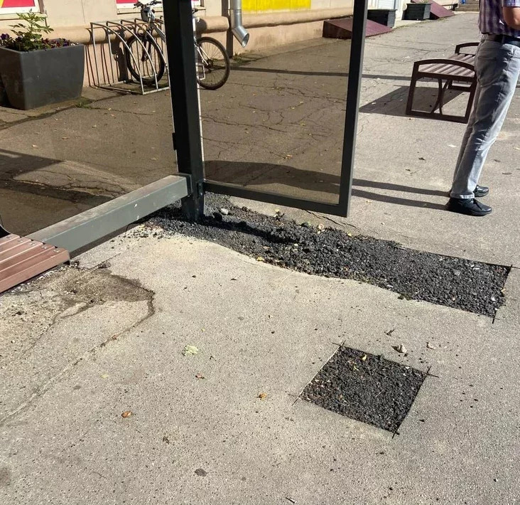 В результате асфальтогранулят рассыпался, образовав углубления, где скапливается мусор. Кроме того, некоторые ямы рядом с остановкой не были засыпаны совсем.