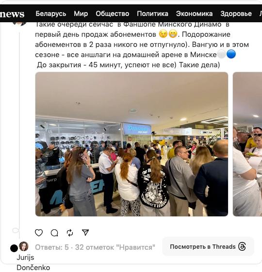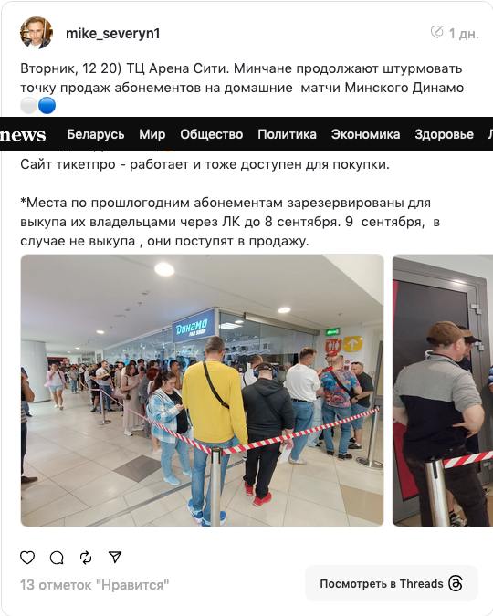 В Минске стартовали продажи абонементов на домашние матчи ХК «Динамо-Минск» на сезон 2025/26, что, судя по всему, сразу же вызвало ажиотаж среди болельщиков. Как сообщили в Threads очевидцы, у точки продаж в ТЦ «Арена-Сити» минчане «штурмуют» фан-шоп, чтобы купить сезонный пропуск на игры, пишет «Телеграф».