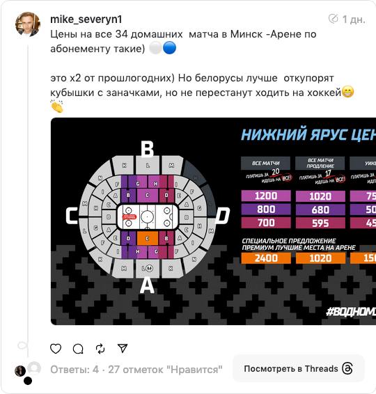 «Подорожание абонементов в 2 раза никого не отпугнуло. Белорусы лучше откупорят кубышки с заначками, но не перестанут ходить на хоккей», — прокомментировали ситуацию в соцсетях.