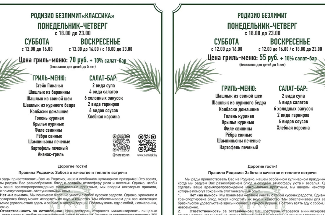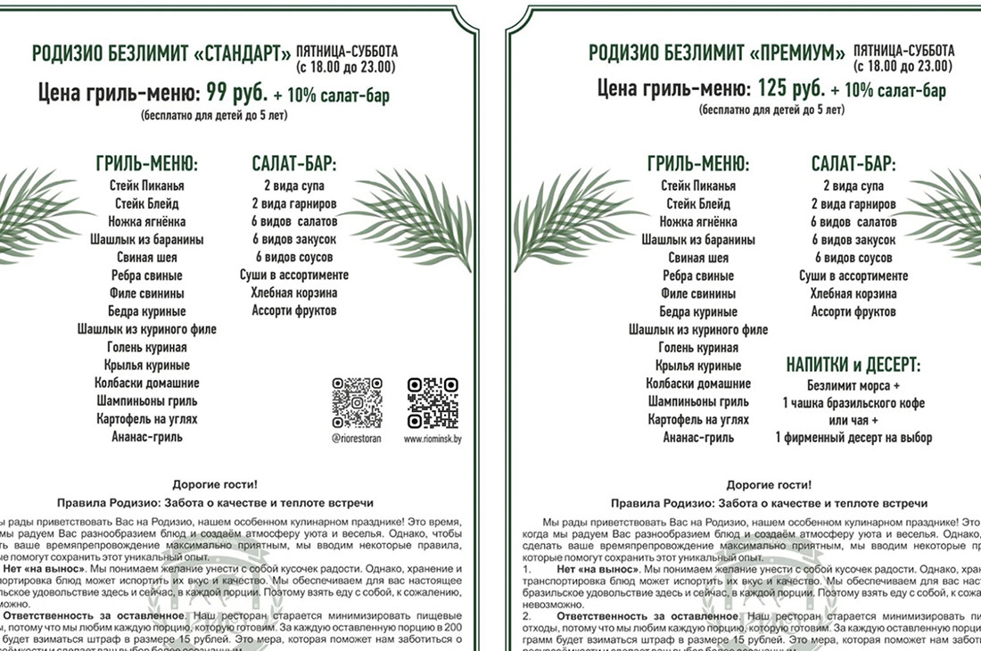 Важная информация: уносить еду из ресторана запрещено. Оставлять недоеденными продукты тоже нежелательно. «За каждую оставленную порцию в 200 граммов будет взиматься штраф в размере 15 рублей. Это мера, которая поможет нам заботиться о ресурсоемкости и сделает ваш выбор более осознанным», — сказано в правилах родизио, опубликованных на сайте ресторана.