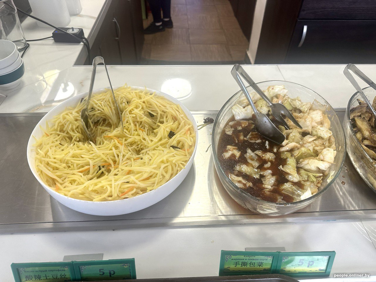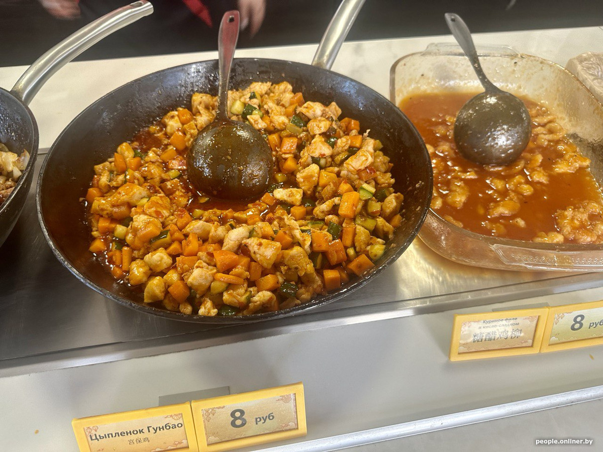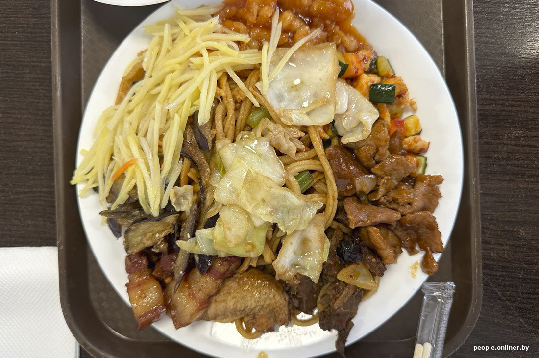 На фоне упомянутых заведений «Панда Экспресс» выглядит небольшой забегаловкой, но со своей фишкой: здесь посетителям за 19 рублей предлагают килограмм еды. Как работает такой формат? Все просто: берете поднос, подходите к сотруднице кафе и говорите, что нужен килограмм. На выбор она предложит базу в виде гарнира (рис или жареную лапшу), а дальше тарелку можно будет заполнять остальными блюдами: жареной свининой, куриным филе в кисло-сладком соусе, грудинкой, жареной капустой… После этого идете на кассу и расплачиваетесь — все по принципу столовой.