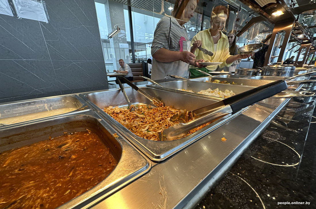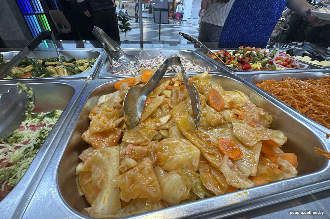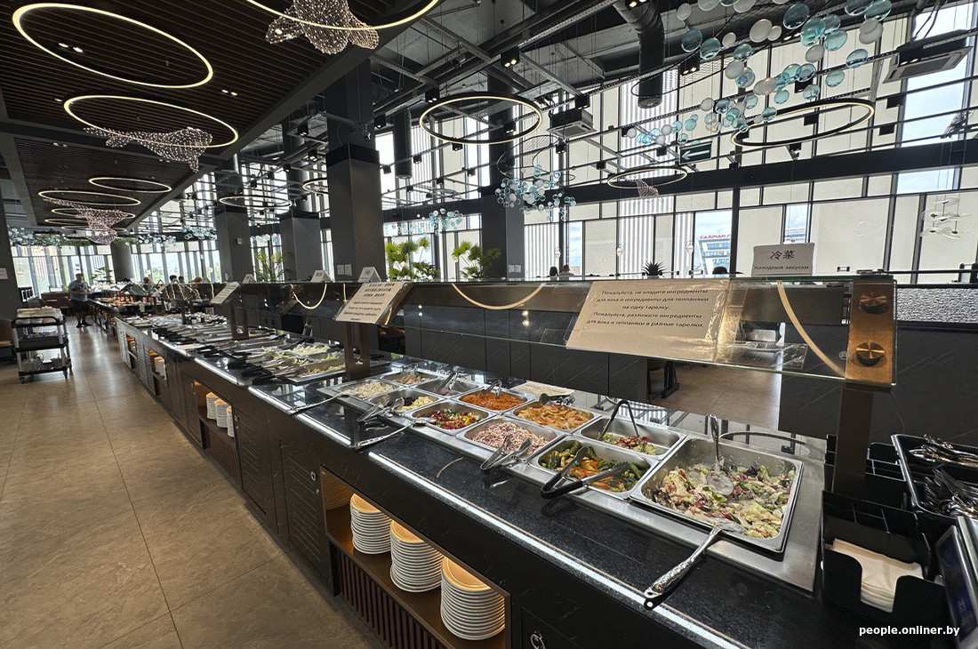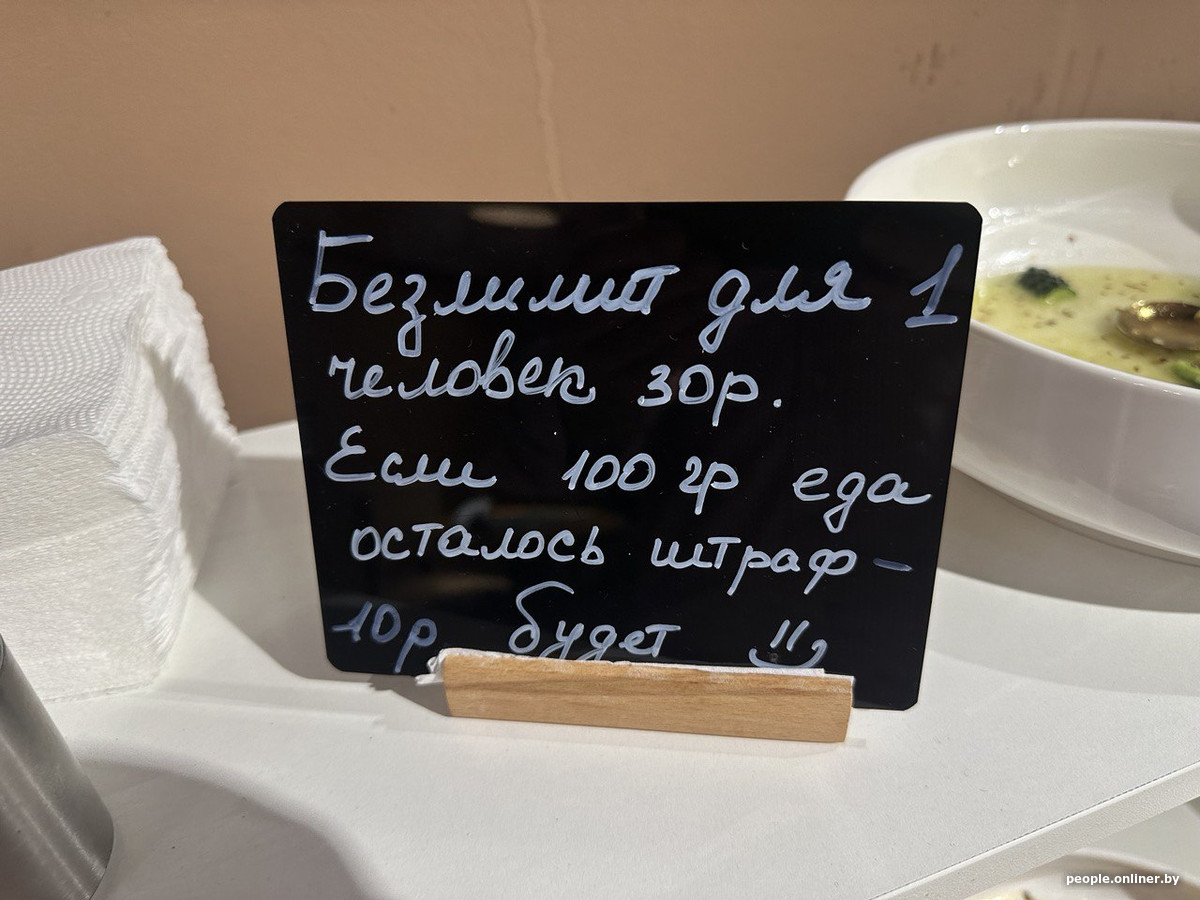 На каждой раздаче висят таблички с советами: берите еду чаще, понемногу и только то, что сможете съесть. И это не случайно: как рассказал управляющий, раньше многие посетители оставляли после себя недоеденные продукты в большом количестве или пытались унести еду домой, что запрещено правилами ресторана.
