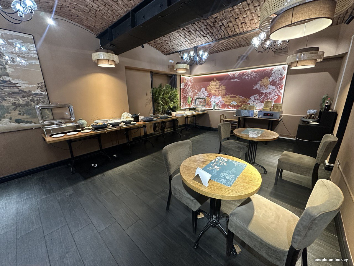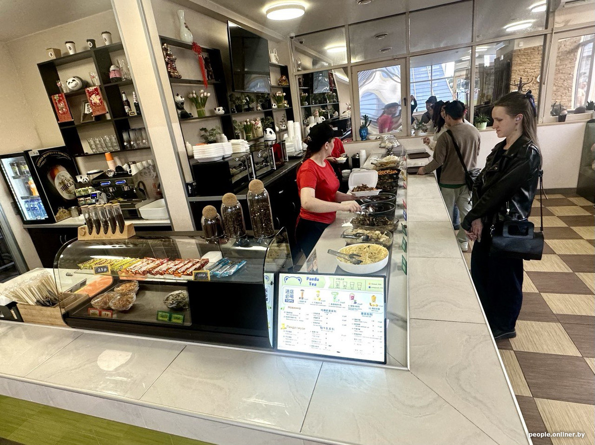Что же так привлекло минчан? В Umi стоят два длинных шведских стола, заставленные едой — от нарезанной грудинки, азиатских супов и овощей до роллов, фруктов и мороженого. Но главная фишка — зона вок. Берете сырое мясо, креветки или овощи, выбираете на табличке соус и отдаете продукты китайскому повару, который готовит блюдо прямо у вас на глазах.