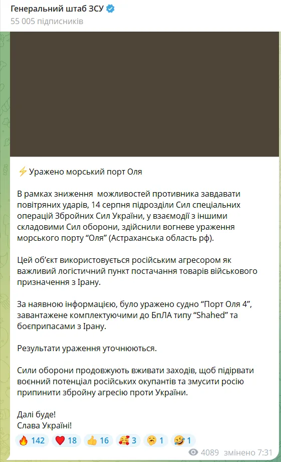 «В рамках снижения возможностей противника наносить воздушные удары, 14 августа подразделения Сил специальных операций Вооруженных Сил Украины, во взаимодействии с другими составляющими Сил обороны, осуществили огневое поражение морского порта "Оля" (Астраханская область РФ). Этот объект используется российским агрессором как важный логистический пункт поставки товаров военного назначения из Ирана», – указано в сообщении.