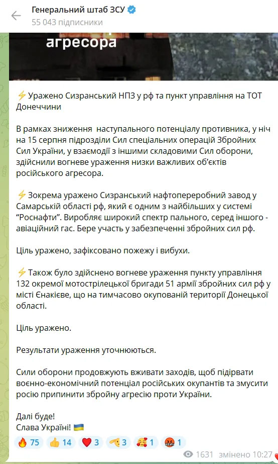 «В рамках снижения наступательного потенциала противника, в ночь на 15 августа подразделения Сил специальных операций Вооруженных Сил Украины, во взаимодействии с другими составляющими Сил обороны, осуществили огневое поражение ряда важных объектов российского агрессора... Осуществлено огневое поражение пункта управления 132 отдельной мотострелковой бригады 51 армии вооруженных сил РФ в городе Енакиево, что на временно оккупированной территории Донецкой области. Цель поражена. Результаты поражения уточняются», – отметили в Генштабе.