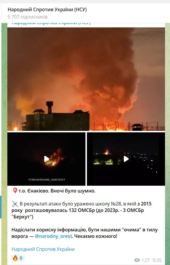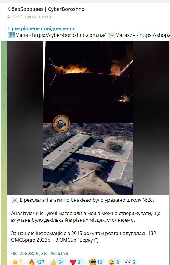 «В результате атаки по Енакиево была поражена школа №28. Анализируя существующие материалы в медиа, можно утверждать, что попаданий было несколько и в разных местах, уточняем. По нашей информации, с 2015 года там располагалась 132 ОМСБр (до 2023года – 3 ОМСБр «Беркут»)», – отмечали после полуночи в Telegram-канале «КиберБорошно».