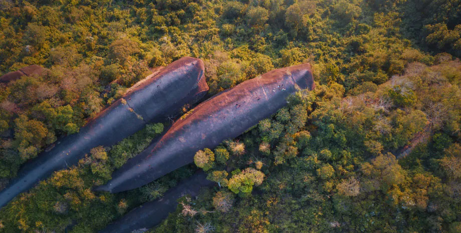 По данным National Geographic, виды со спин «двух взрослых китов» простираются до реки Меконг и гор в районе Паккадинг в Лаосе. Каменные киты будто восседают на горном хребте и возвышаются над пологом леса, что лишь усиливает иллюзию того, что они — морские обитатели в естественной среде обитания.