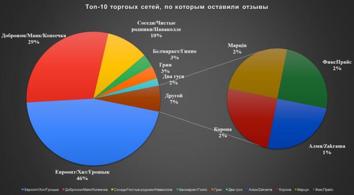 «В рамках проекта «Народный контроль» потребители высказали мнение о состоянии порядка 2,2 тыс. торговых объектов. Наибольшая активность проявлена в отношении: «Евроопт/Хит/Грошык» — 46%, «Доброном/Маяк/Копеечка» — 29%, «Соседи/Чистые родники/Наваколле» — 10%», — сообщили в МАРТ.