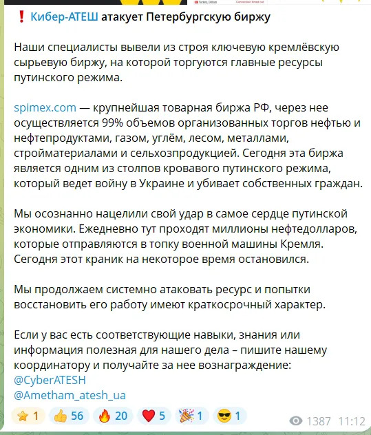 Хакеры военного движения украинцев и крымских татар «Атеш» провели кибероперацию против РФ. Они «положили» ключевую российскую сырьевую биржу, через которую проходит до 99% организованных торгов российскими ресурсами, включая нефть, газ и уголь.