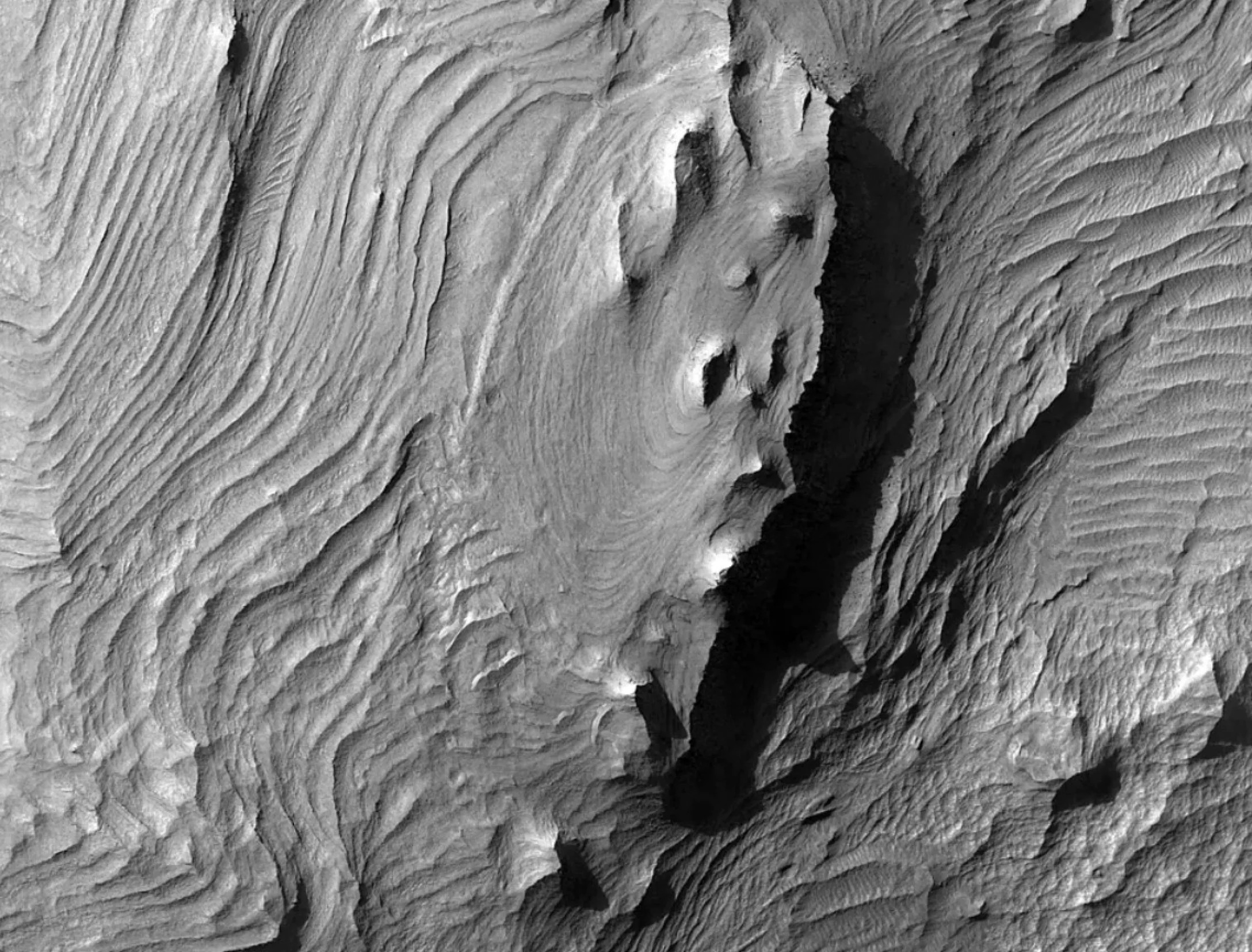 Камера HiRISE имеет очень высокое разрешение и позволяет видеть много деталей на поверхности Красной планеты. На новом изображении видны слоистые отложения осадочного материала толщиной в несколько метров. Важно отметить, что эти слои осадочного материала должны датироваться временем после образования самого каньона, поскольку они, по-видимому, были деформированы тектоническими движениями.