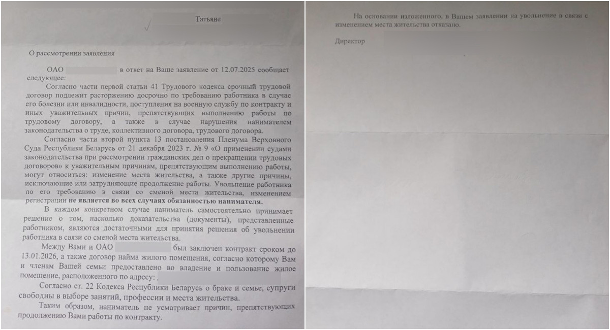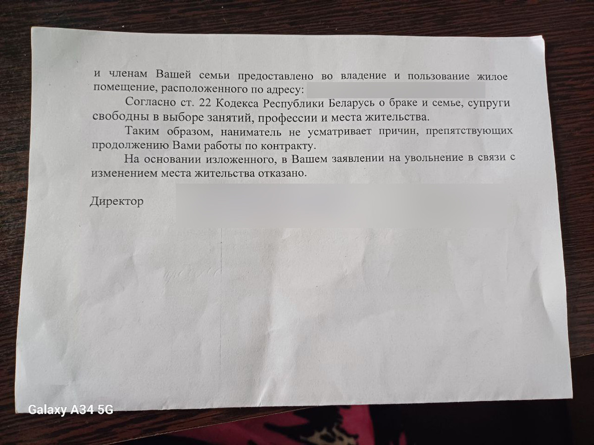 Например, начальник цеха на коммунальном предприятии переехал в Гомель к жене. На работу стало ездить далеко — 40 км в одну сторону. Как и в случае Татьяны, он дважды просил уволить его раньше окончания контракта, но руководство отказало.