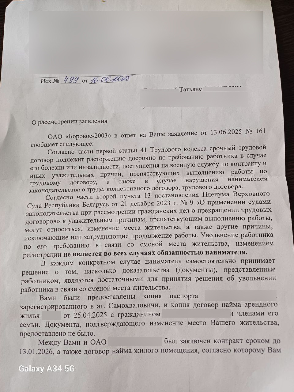 «Согласно ч. 2 п. 13 постановления Пленума Верховного Суда Республики Беларусь от 21 декабря 2023 года №9 «О применении судами законодательства при рассмотрении гражданских дел о прекращении трудовых договоров», к уважительным причинам, препятствующим выполнению работы, могут относиться: изменение места жительства, а также другие причины, исключающие или затрудняющие продолжение работы. Увольнение работника по его требованию в связи со сменой места жительства, изменением регистрации не является во всех случаях обязанностью нанимателя», — говорится в ответе организации.