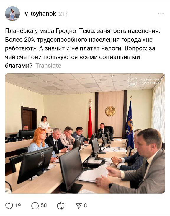 Выяснилось это внезапно. Корреспондент «Гродно плюс» побывала на планерке у председателя горисполкома и написала во вражеской соцсети: «Более 20% трудоспособного населения города «не работают». А значит и не платят налоги. Вопрос: за чей счет они пользуются всеми социальными благами?»