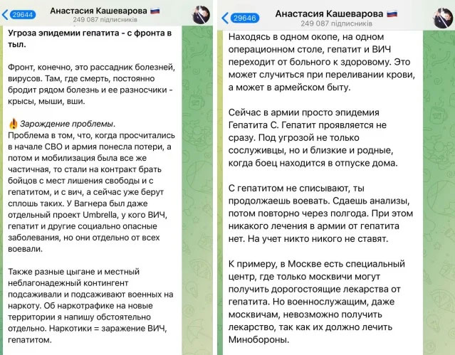 И все это на фоне продолжающегося пополнения армии заключенными и маргиналами, набранными по ускоренным схемам мобилизации. «Сейчас в армии просто эпидемия гепатита С. Гепатит проявляется не сразу. Под угрозой не только сослуживцы, но и близкие, и родные, когда боец находится в отпуске дома», — предупреждает Кашеварова в своем Telegram-канале.