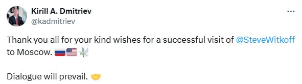 Посланник РФ по вопросам инвестиций Кирилл Дмитриев, который встречал утром американского политика в аэропорту, прокомментировал переговоры Путина и Уиткоффа так: «Диалог восторжествует».